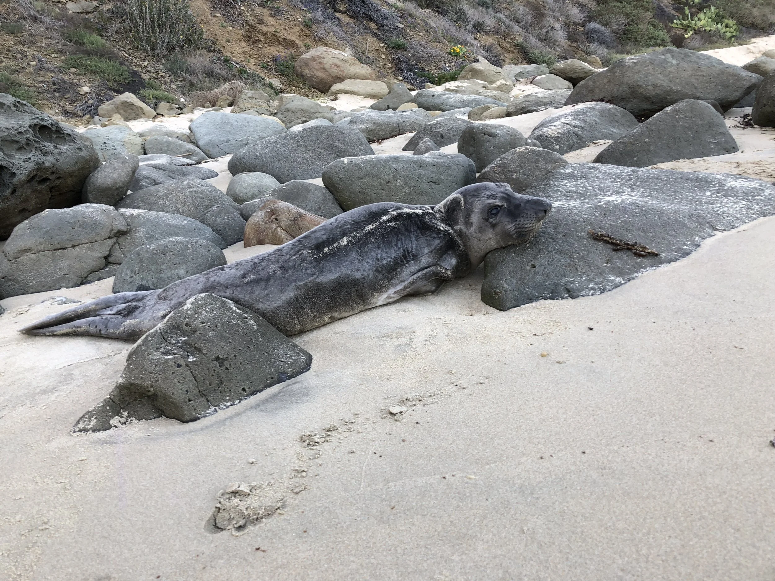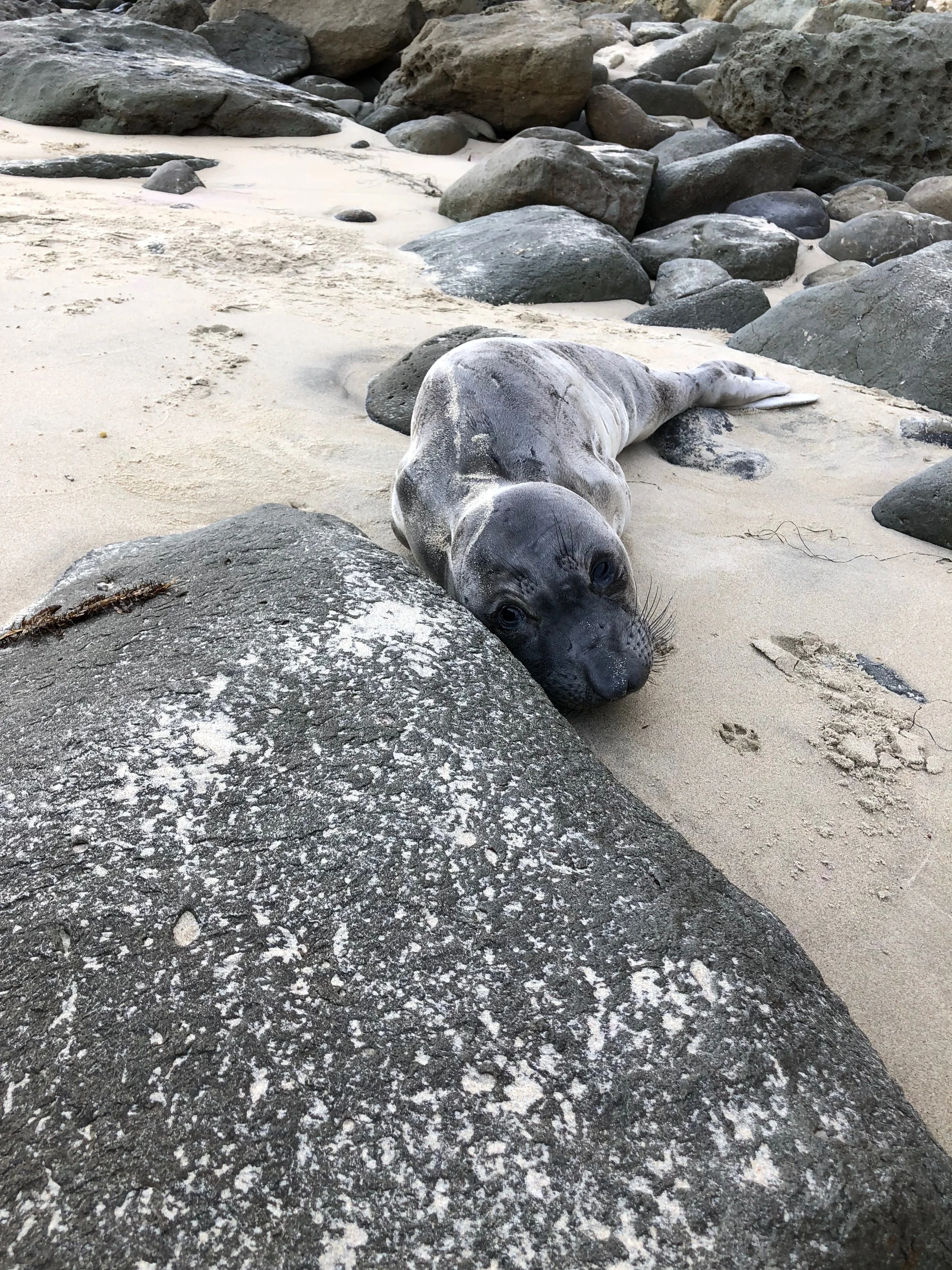 Time passes as I sit beside this doe-eyed sea-dweller. He, caught between a rock and a hard place. Me, wondering what one is supposed to do in this situation.